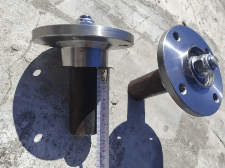 Длина вала составляет 8 см, а его диаметр – 40 мм, что позволяет использовать ступицу с большинством стандартных осей для мотоблочных прицепов. Разболтовка 98×4 соответствует популярным колесам, которые легко найти и заменить в случае необходимости. Конструкция также включает шайбу и гайку М16 с шагом 2, обеспечивающим надежное крепление колеса к оси.