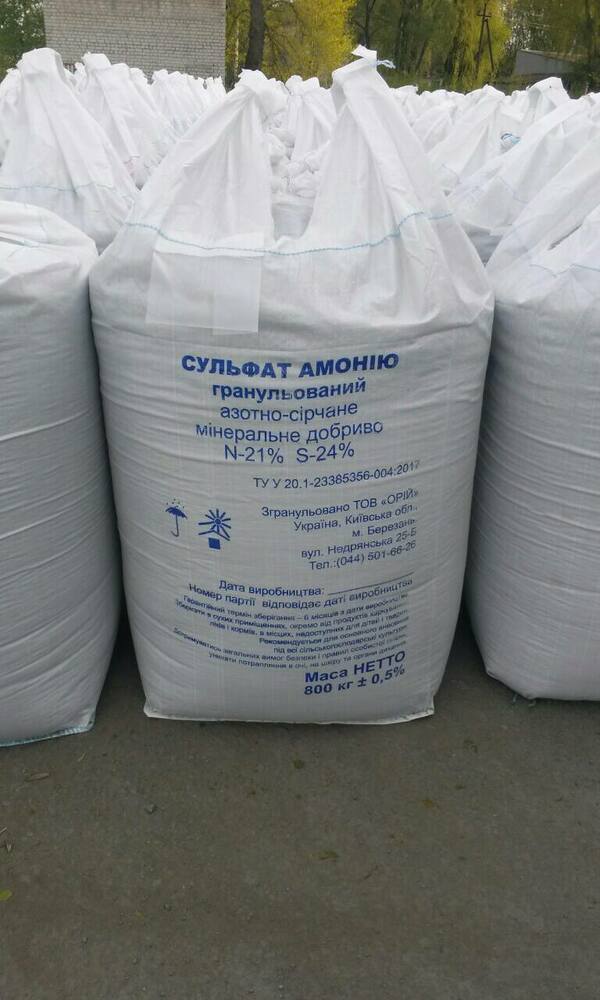 Пропонуємо сульфат амонію гранульований (N-21%, S-24%) в біг-бегах по 850 кг. Розмір гранул - 4-6 мм. Можлива доставка залізницею по Україні (вагонні норми).