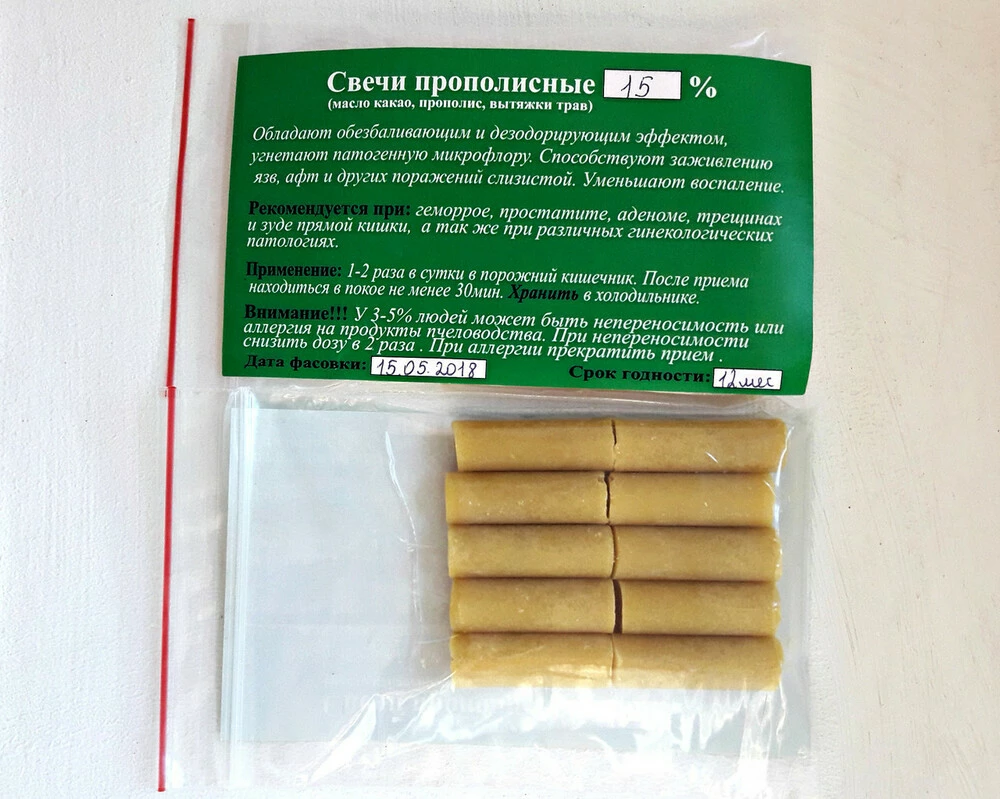 Рекомендуется принимать при геморрое,простатите,аденоме,трещинах и зуде прямой кишки.Применяются также при различных гинекологических недугах:афты,язвы,бактериальные инфекции,послеродовые осложнения и др.Содержат масло какао,воск,прополис.
