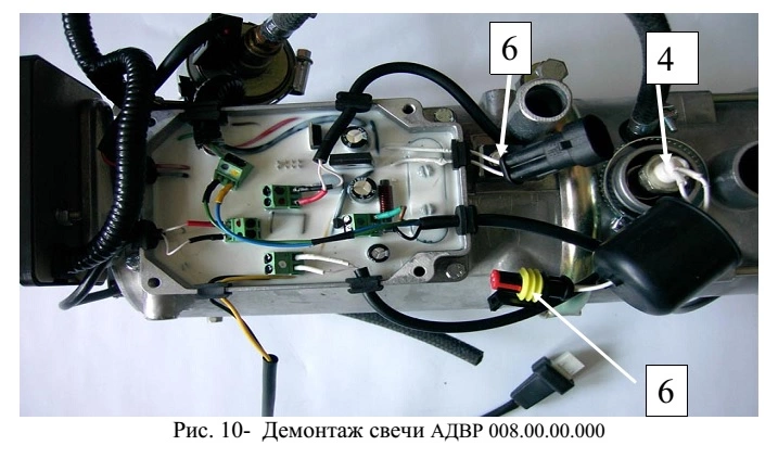 - зняти забірник повітря, гумову заглушку, що закриває свічку, та від’єднати підведені дроти (необхідно роз’єднати раз’єм поз. 6);