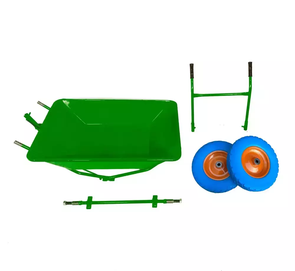 Тачка двоколісна розбірна колесо ПУ(безкамерна)станет незаменимым помощником на стройке или других местах, где есть угроза прокола. Бескамерные колеса из прочного и эластичного пенополиуретана (ППУ) диаметром 390 мм, шириной 10 мм на 2-х роликовых подшипниках в сочетании с вместительным стальным кузовом позволяют перемещать грузы свыше 350 кг.