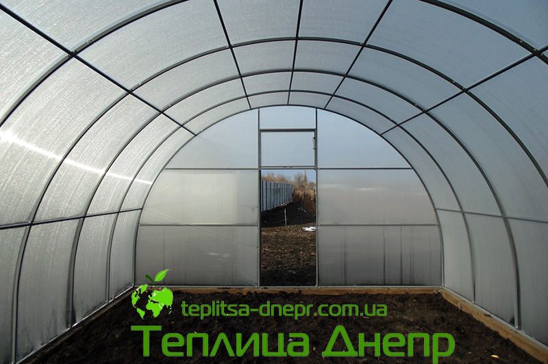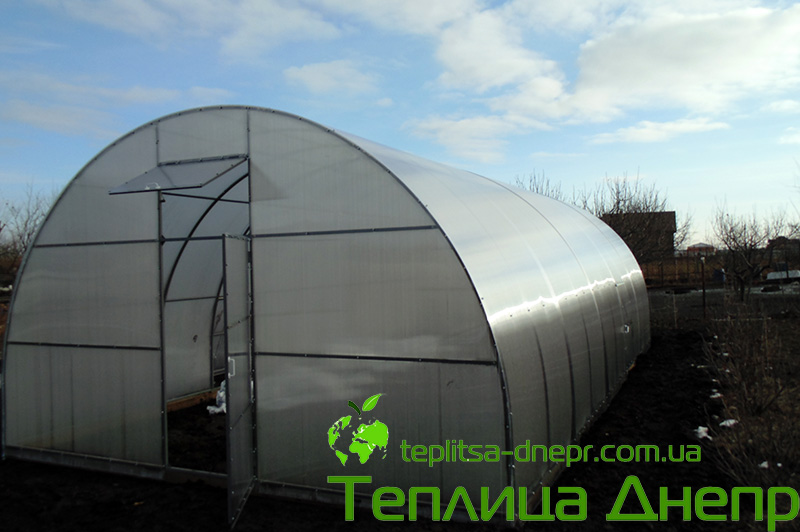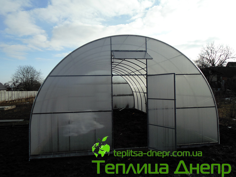 Теплица шириной 5 метров, высотой 3 метра и длиной начиная от 8 метров, и далее по 2 метра добавляется. Каркас теплицы 25х25мм, покрывается труба полимерной краской. Шаг дуги 1 метр. Продольная стяжка между дугами. Перекрывается теплица сотовым поликарбонатом, с высокой степенью защиты от УФ, и гарантией от производителя 10 лет.