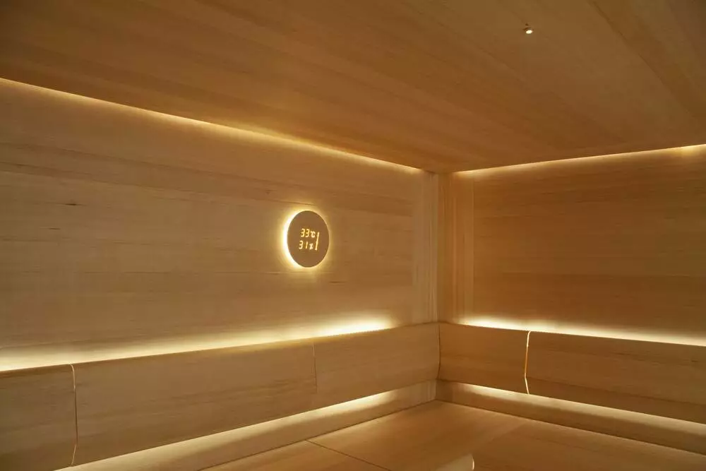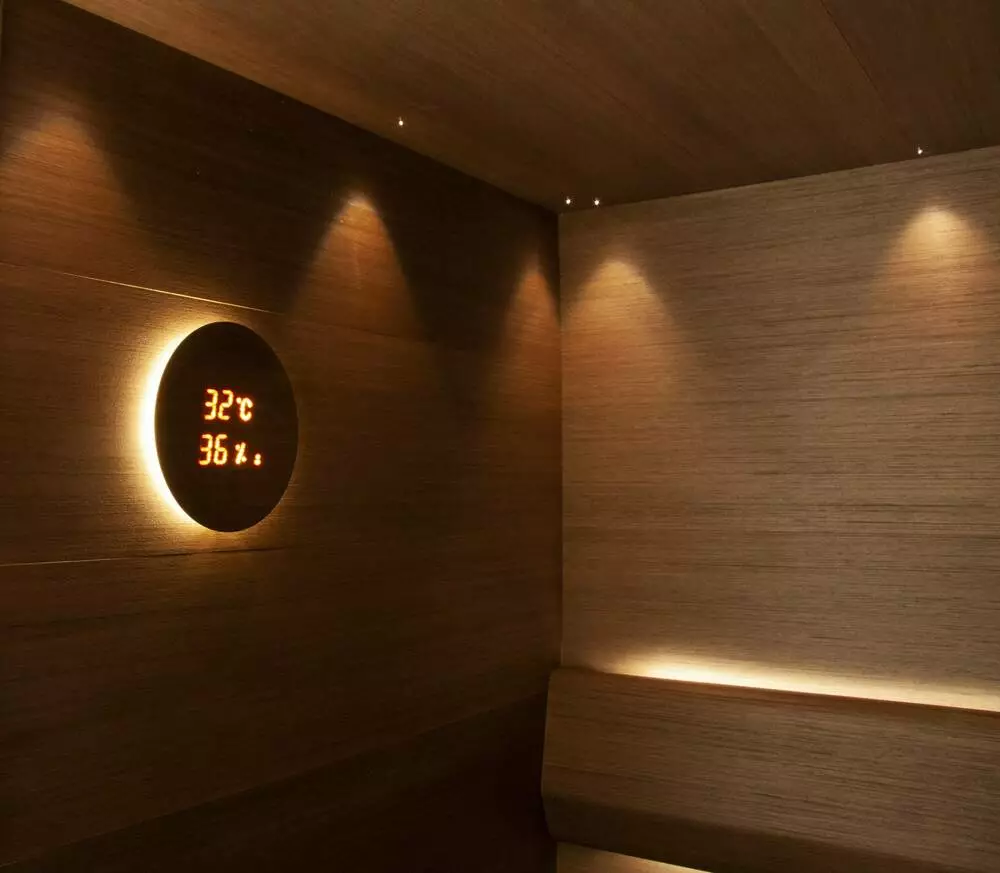 • Инновационный дизайн: показатели отображаются через деревянную панель, что добавляет стиля интерьеру сауны.