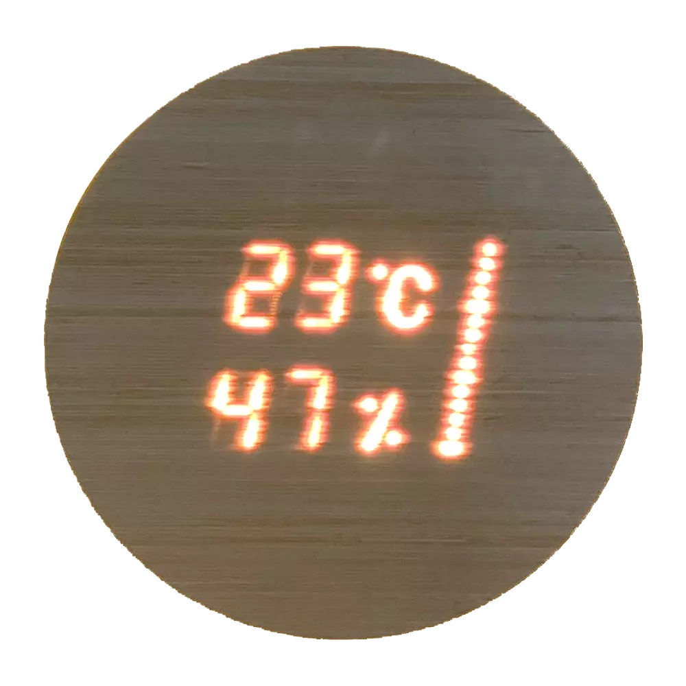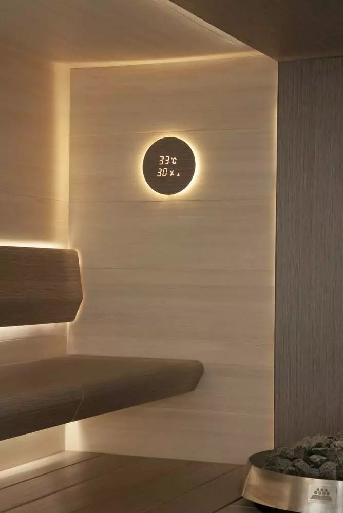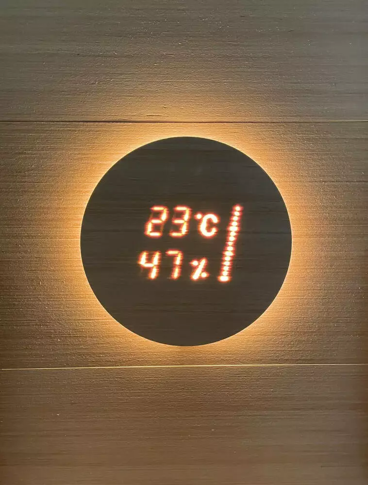 Термогигрометр Aspectu — это современное решение для контроля температуры и влажности в саунах, которое поражает своим элегантным и функциональным дизайном. Уникальная технология позволяет проецировать показатели устройства прямо через деревянную панель, это создает эстетичный вид и обеспечивает удобство его использования.