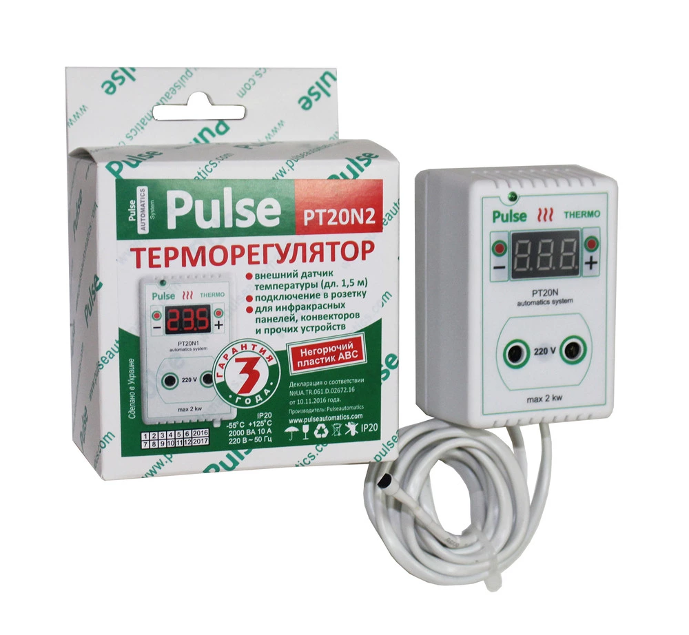 Терморегулятор PT20-N2 (Микропроцессорный терморегулятор двухпороговый, применяется в системах отопления, обогрева тилей типа «УФО», всех видов конвекторов, инфракрасных панелей, для управления температурой теплых полов,управление нагнетательного вентилятора твердотопливных котлов, бассейнов, теплиц, морозильных камер, сушилок, систем обогрева ульев, системы для не замерзания водосливов, инкубаторов и т.д.