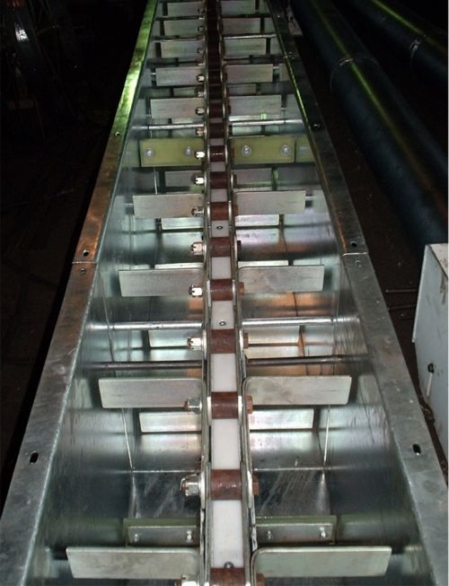 • Цепь открыто-шарнирная из углеродистой стали, толщиной 7 мм, работает без смазки и не забивается транспортируемым материалом. На скребки насажены полимерные  накладки, позволяющие значительно снизить износ коробов.