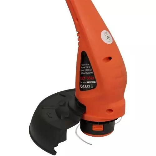 В работе триммера используется шпуля с леской диаметром 1,2 мм, приводимая в движение надежным электродвигателем мощностью 250 Вт и частотой вращения 11000 об/мин. Таким образом, обеспечивается быстрое и чистое скашивание густой трави и сухостоя. Диаметр скашивания при этом составляет 25 см.
