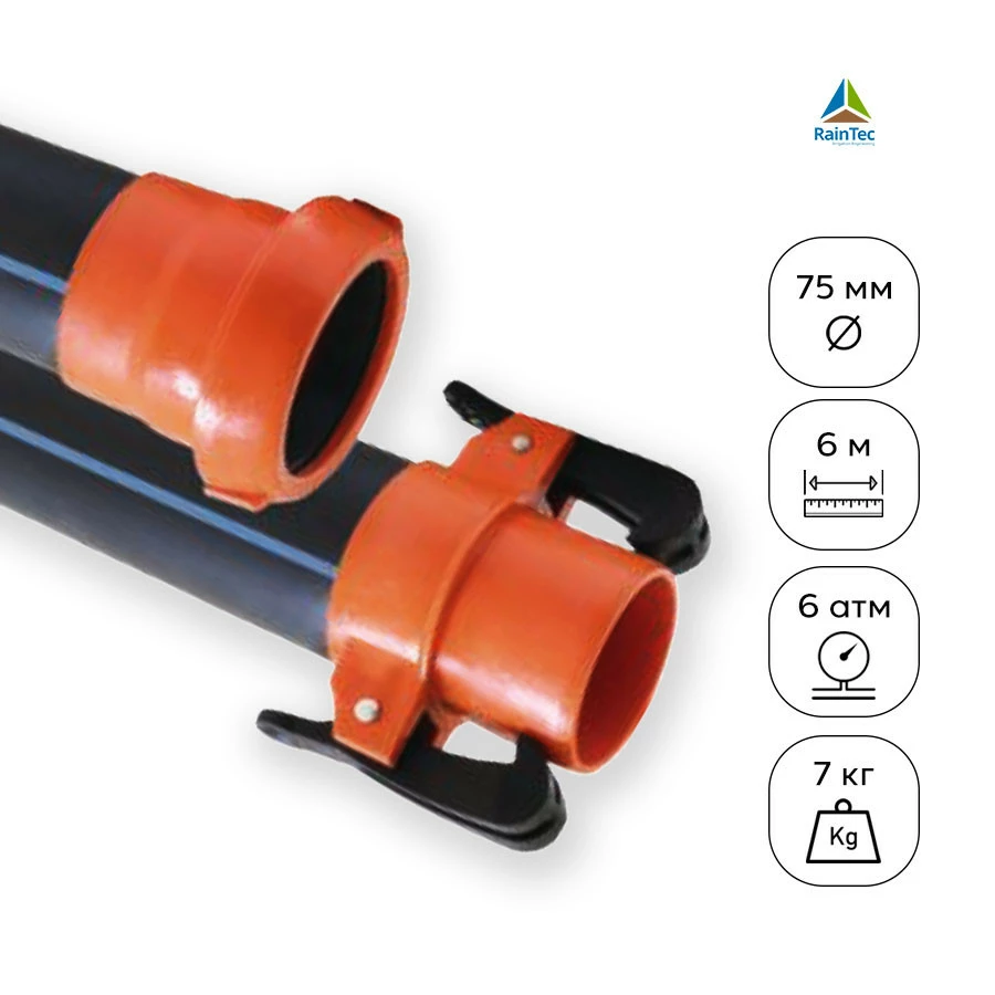 Труба для полива 75 мм, 6 атм, 6 м, муфта соединительная быстрой сборки