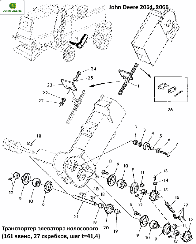 Цепь колосового элеватора John Deere AZ46269, Транспортер элеватора колосового (161 звено, 27 скребков, t=41,4), применение JD2066, JD2264, JD2266, JD2066, JD2256, JD2064