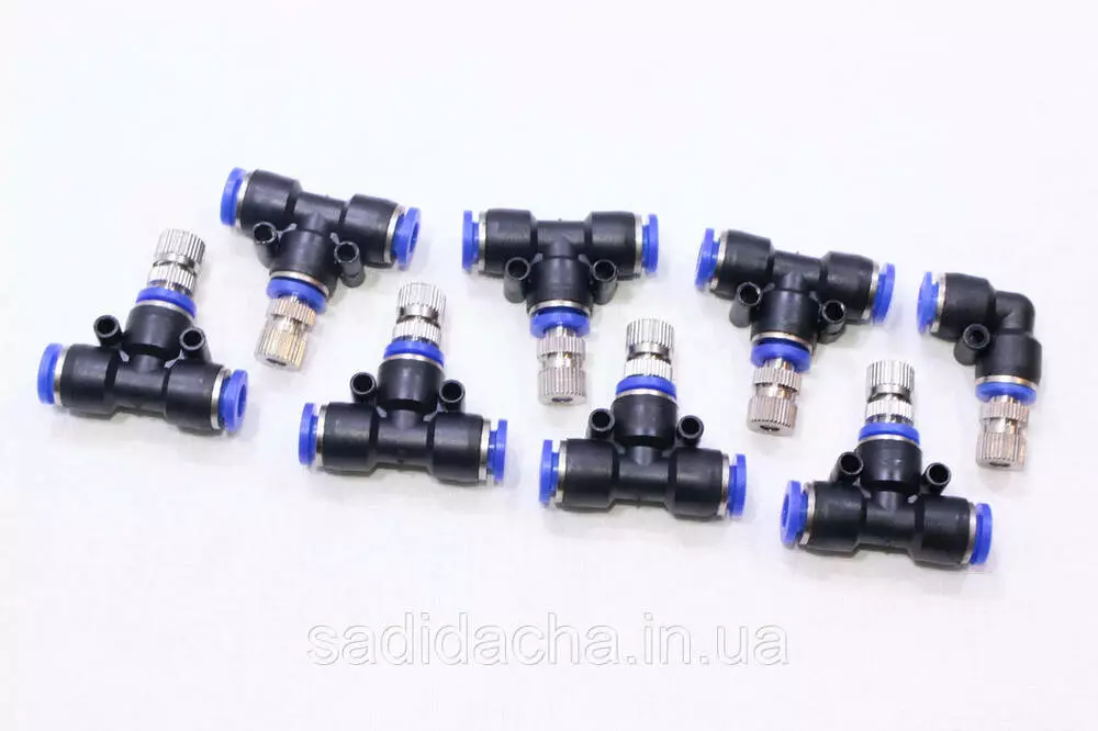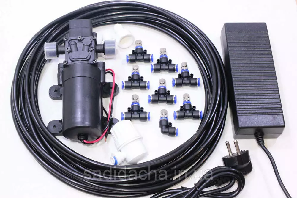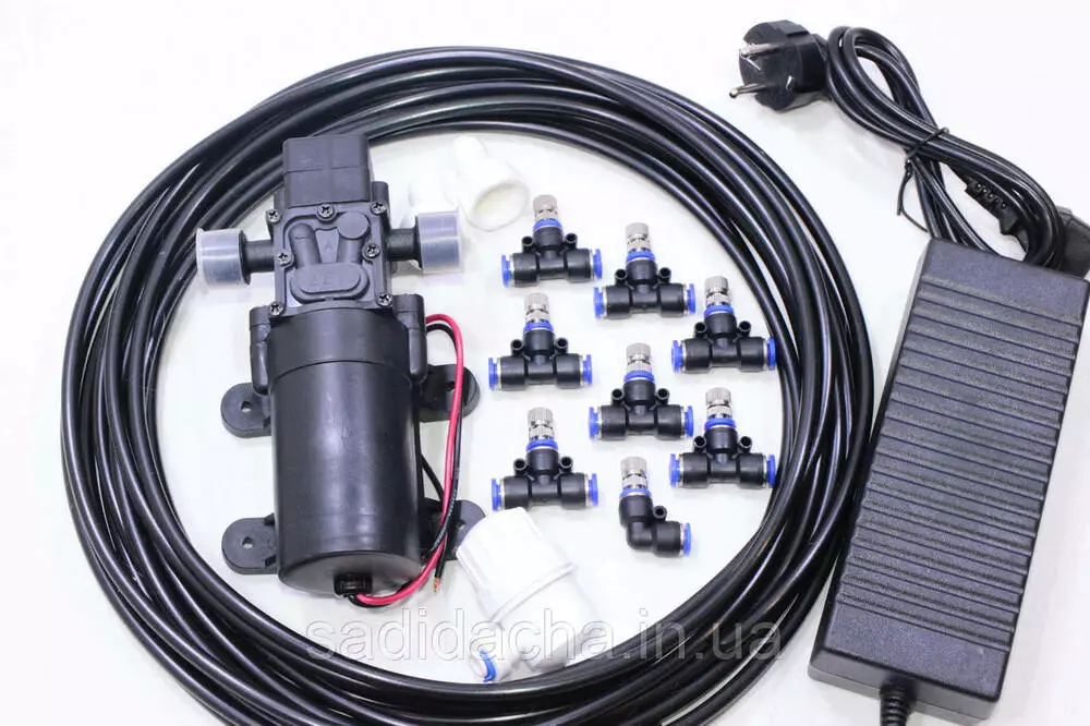 Бытовая система туманообразования на 8 форсунок. Полный комплект. Самовсасывающий насос 12 вольт 60 ватт подает воду на 8 форсунок (туманообразователи) в результате чего образуется мелкодисперсный туман.