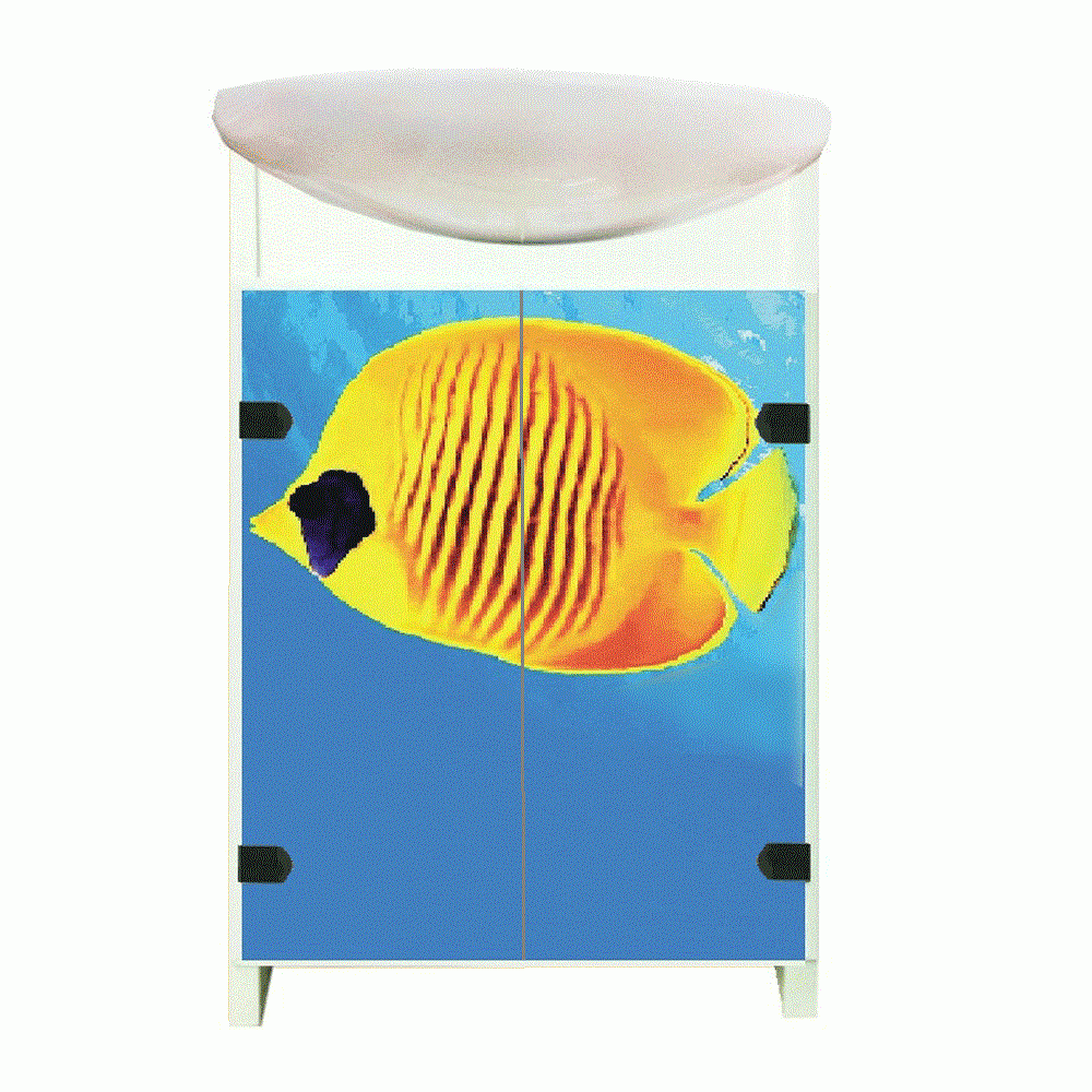 Мебель из пластика это как раз то что нужно для долгосрочной службы мебели в ванной комнате. Боковые стороны тумбы белые. Какой замечательный и яркий рисунок на распашных дверках из композита! Цвет рыбки такой радостный. Рыбка вроде как есть, а ухаживать и кормить ее не надо. Правда, здорово.