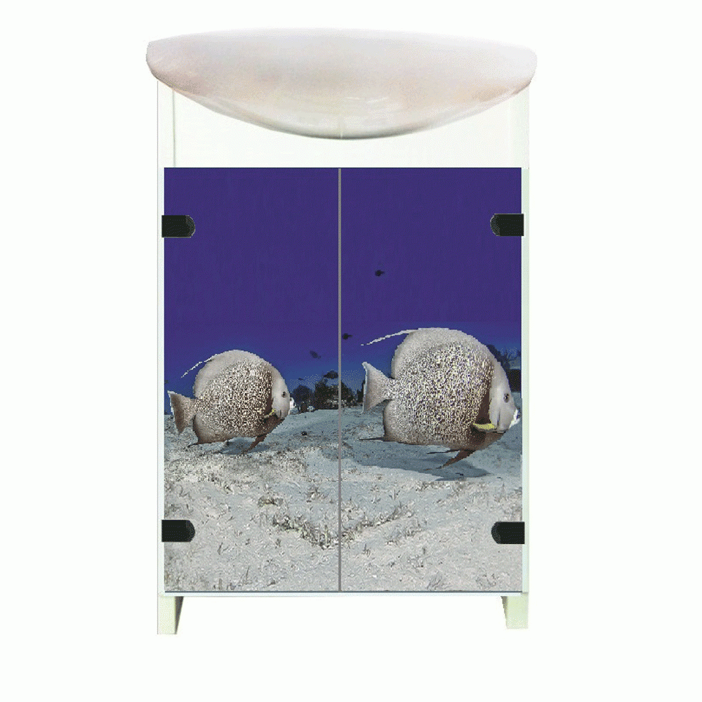 Мебель из пластика - это как раз то, что нужно для долгосрочной службы мебели в ванной комнате. Боковые стороны тумбы белые. Какой замечательный и яркий рисунок на распашных дверках из композита!  Рыбки вроде как есть, а ухаживать и кормить их не надо. Правда, здорово.