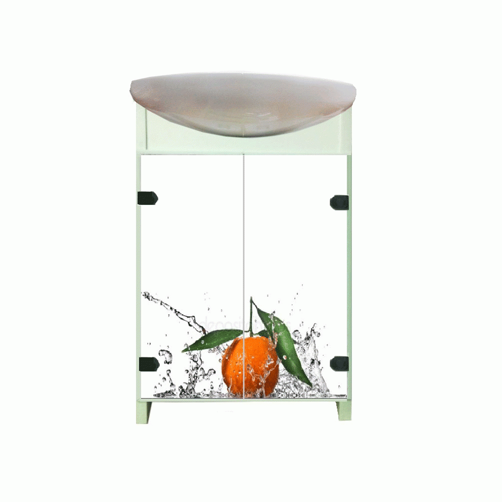 Мебель из пластика это как раз то что нужно для долгосрочной службы мебели в ванной комнате. Боковые стороны тумбы белые. Необычно смотрится апельсинчик на дверках тумбы. Взглянешь на него с утра и невольно улыбнёшься. Комплектуется керамической раковиной Церсанит Cersania 50см