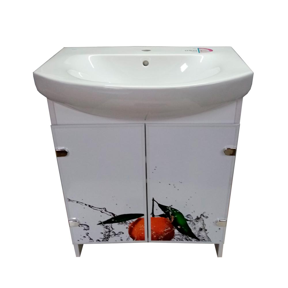 Мебель из пластика это как раз то что нужно для долгосрочной службы мебели в ванной комнате. Боковые стороны тумбы белые. Необычно смотрится апельсинчик на дверках тумбы. Взглянешь на него с утра и невольно улыбнёшься.