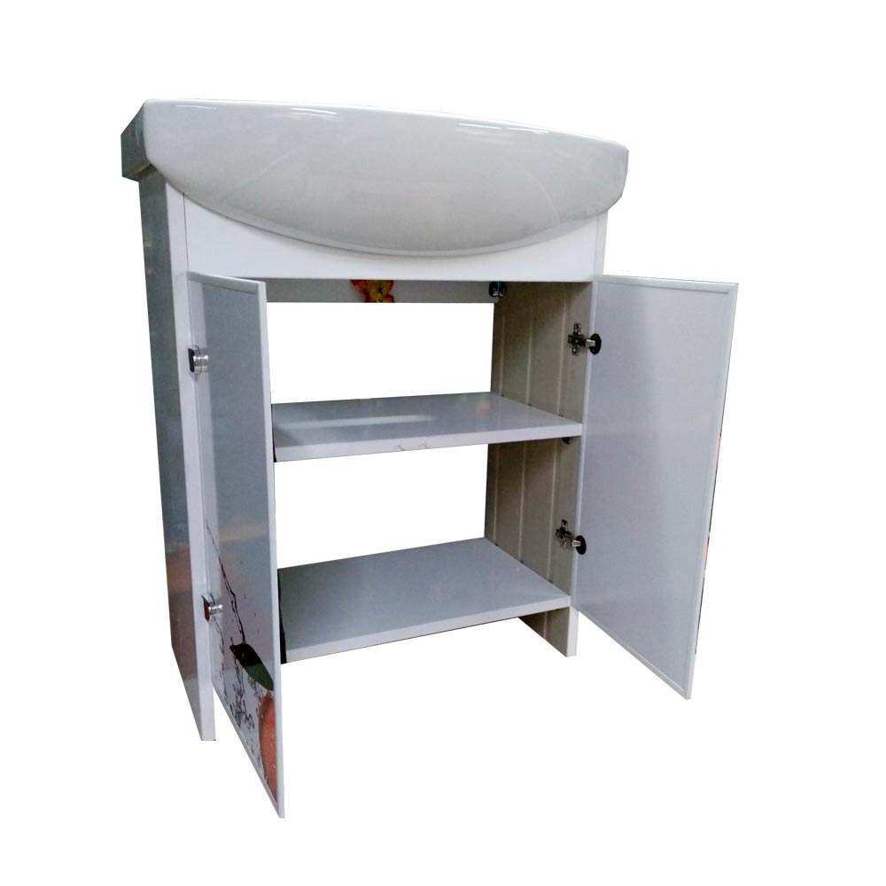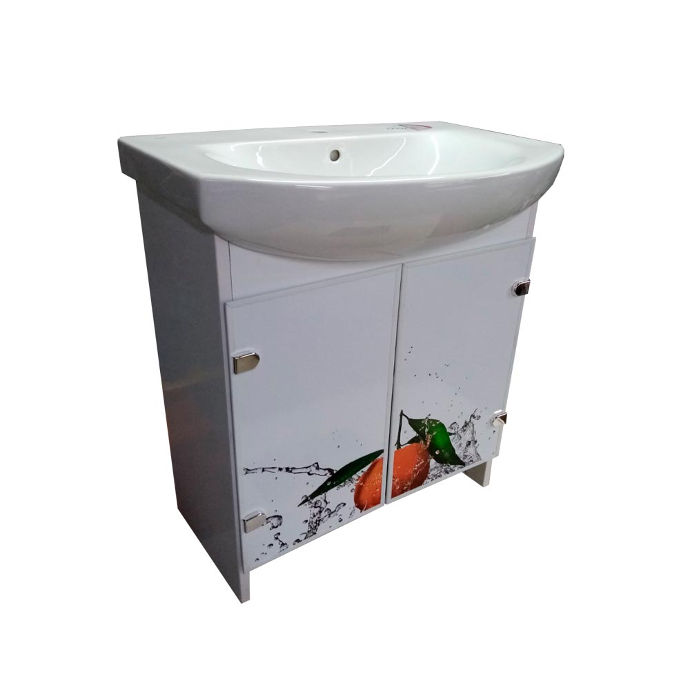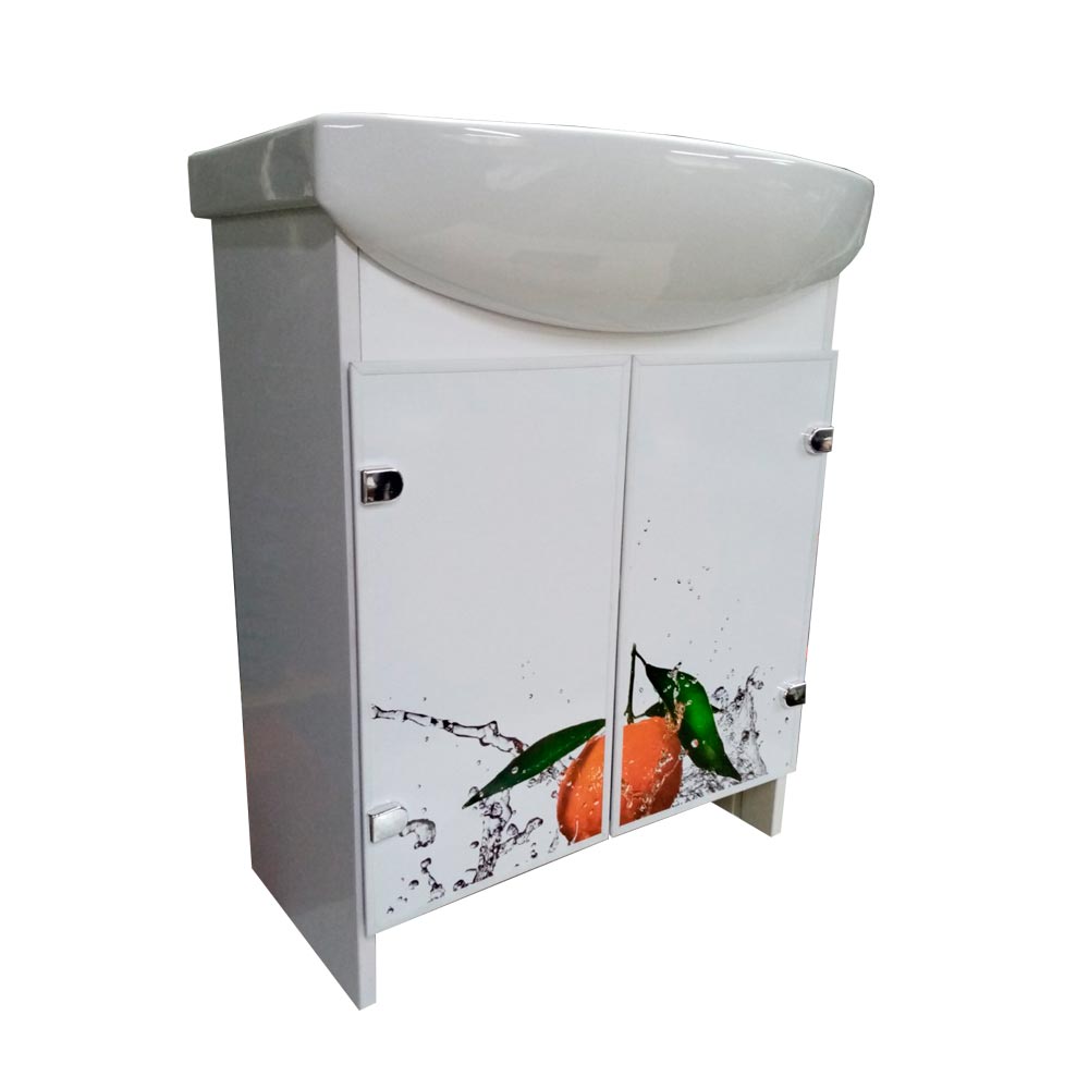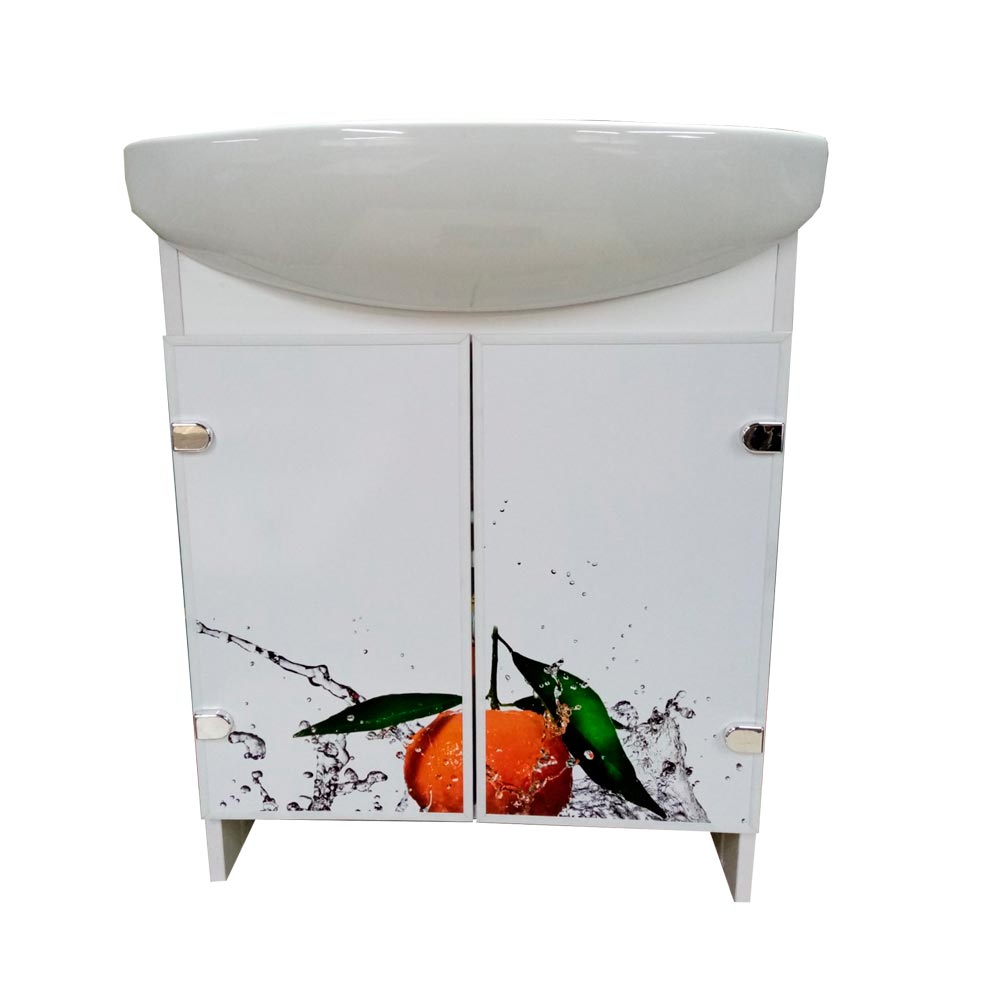 Мебель из пластика это как раз то что нужно для долгосрочной службы мебели в ванной комнате. Боковые стороны тумбы белые. Необычно смотрится апельсинчик на дверках тумбы. Взглянешь на него с утра и невольно улыбнёшься. Комплектуется керамической раковиной Лотос 70 см