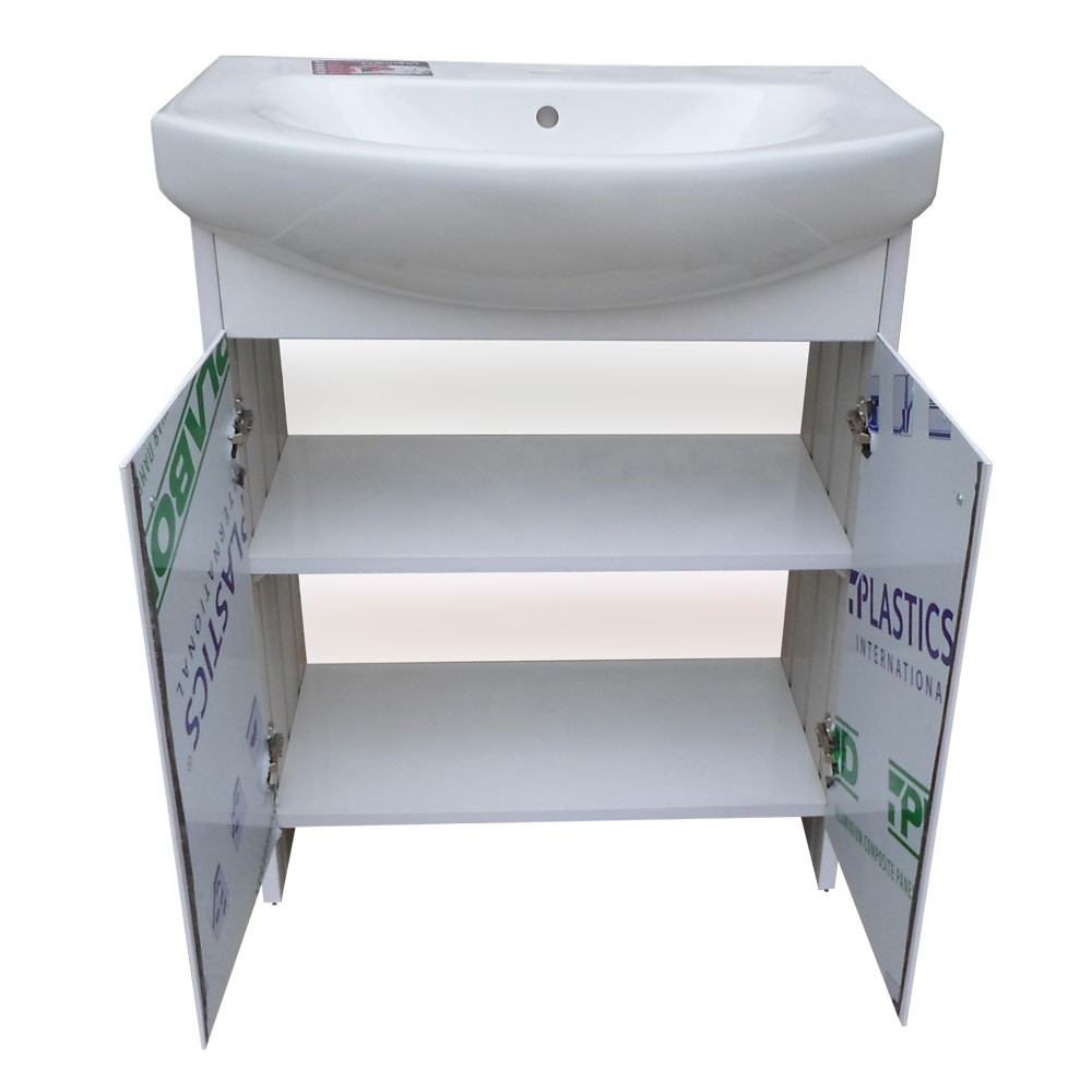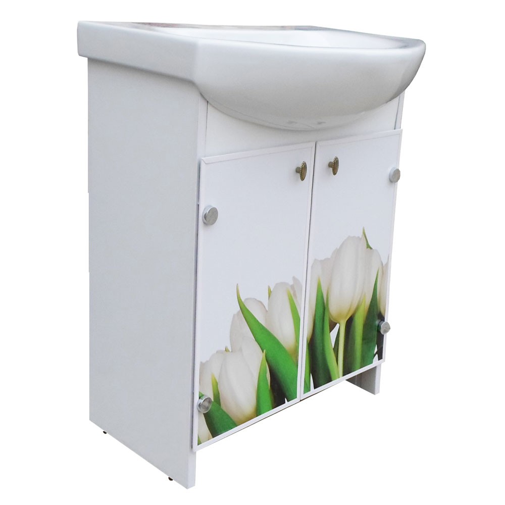 Мебель из пластика - это как раз то, что нужно для долгосрочной службы мебели в ванной комнате. Боковые стороны тумбы белые. На дверках тумбы изображены весенние цветы - тюльпаны.  Скромно, но так мило!