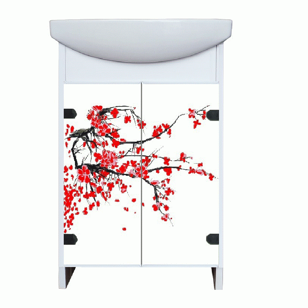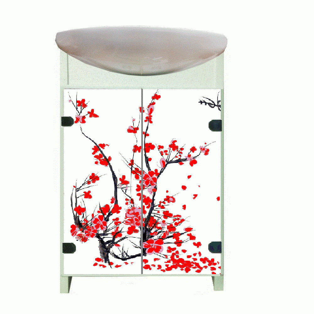 Мебель из пластика это как раз то что нужно для долгосрочной службы мебели в ванной комнате. Боковые стороны тумбы белые. На дверках тумбы изображены весенние цветы - Японская сакура. В Японии сакура является очень важным национальным символом. Все люди живущие в Японии собираются в период цветения и любуются её цветами. Цветы сакуры рисовали пилоты на своих самолетах в качестве мирной символики. Её также наносят на все поверхности: керамика - посуда, ткани - кимоно, канцелярия... А для кого-то это будет просто красивое изображение. Тумба выполнен из пластика  и дверки композит. Укомплектован керамической раковиной Cersanit 50см