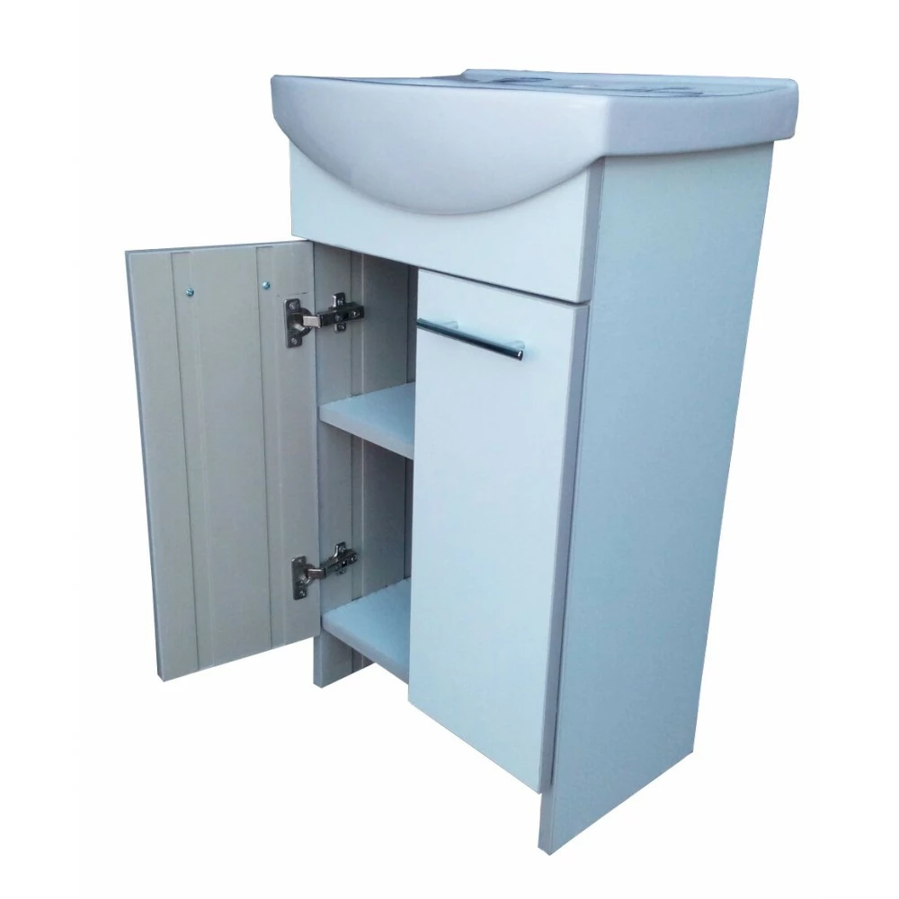 Мебель из пластика это как раз то что нужно для долгосрочной службы мебели в ванной комнате. Тумба выполняется белого цвета, торцы серого цвета. Тумба имеет распашные дверки и полочку, где Вы сможете разместить бытовые моющие средства.