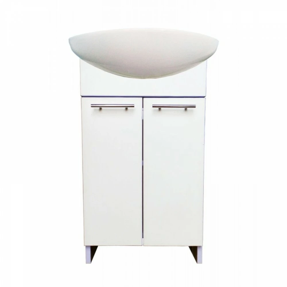 Тумба полностью сделана из пластика и не боится повышенной влажности в ванной комнате, поверхность имеет гладкую поверхность что позволяет легко ухаживать за тумбой в процессе эксплуатации. Окантовка белого цвета. Просто "Классика". Две распашные дверцы. Горизонтальная полочка делит пространство на 2 части. Овальный керамический умывальник входит в комплектацию.