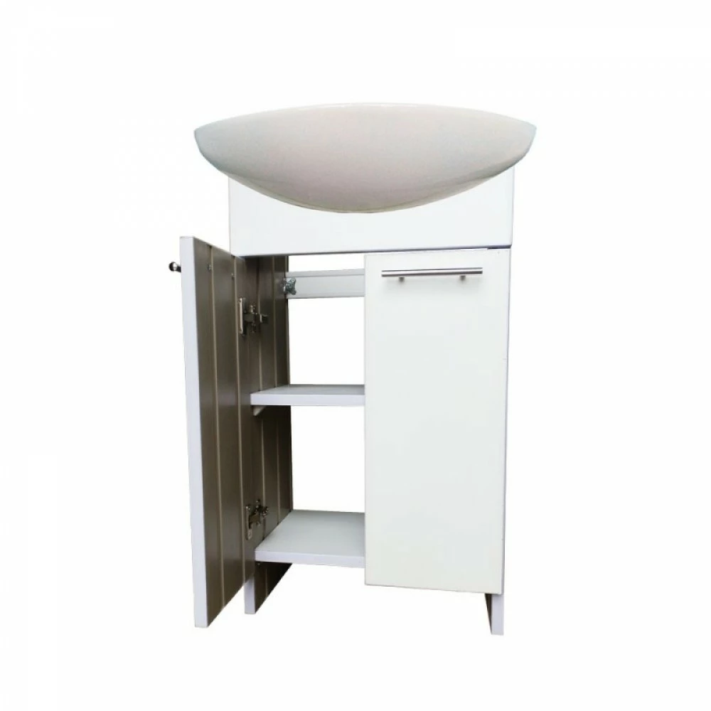 Тумба полностью сделана из пластика и не боится повышенной влажности в ванной комнате, поверхность имеет гладкую поверхность что позволяет легко ухаживать за тумбой в процессе эксплуатации. Окантовка белого цвета. Просто "Классика". Две распашные дверцы. Горизонтальная полочка делит пространство на 2 части. Овальный керамический умывальник входит в комплектацию.