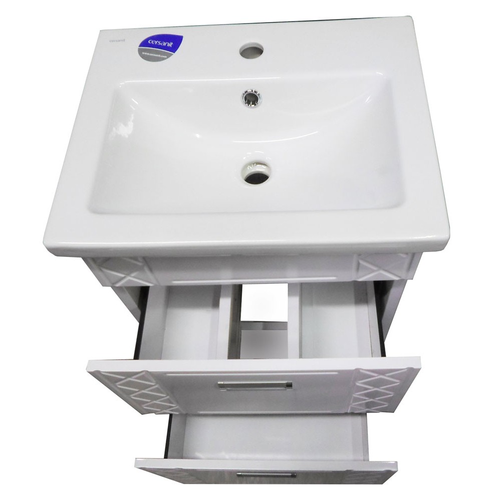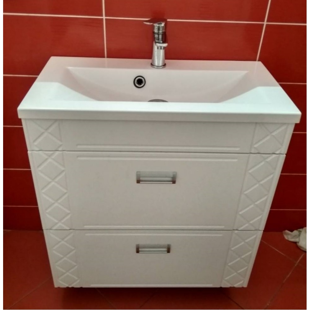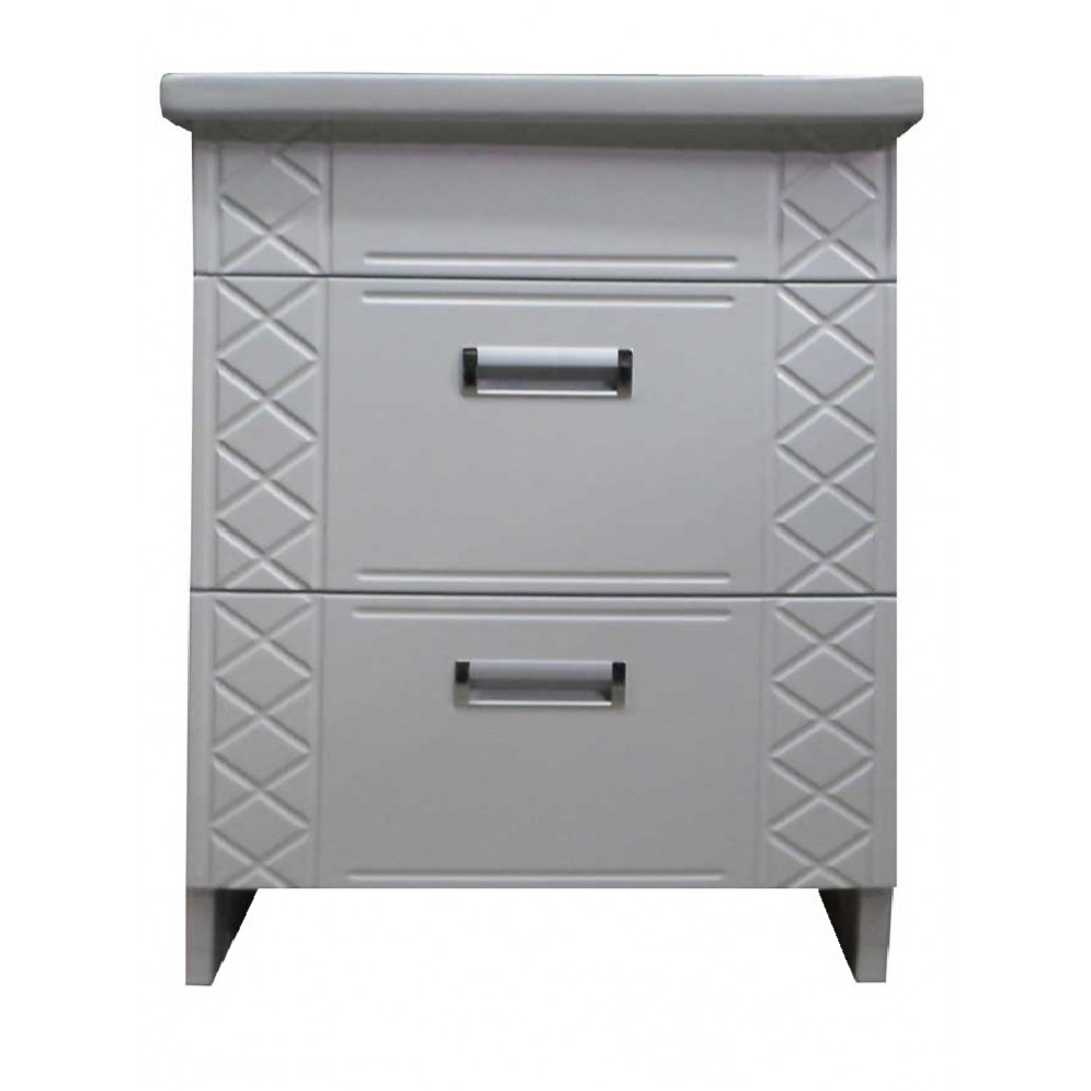 Мебель из пластика это как раз то, что нужно для длительного обслуживания мебели в ванной. Красивая напольная белая тумба с узором. Выдвижные ящики. Материал корпуса выполнен из пластика. Материал фасада - МДФ. Размеры по ширине 70 см, высота - 80 см, глубина - 42 см. Квадратная керамическая раковина расположена по центру