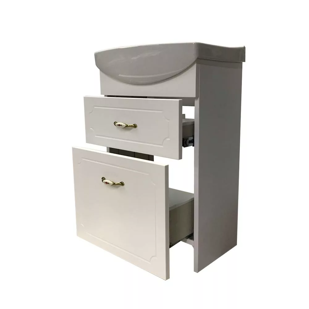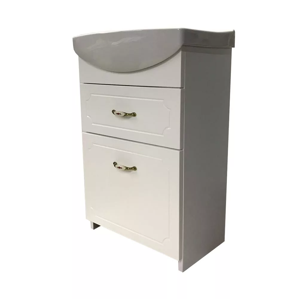 Пластиковый корпусФасад МДФвыдвижные ящики с механизмом плавного закрытиякерамический умывальник фабрики Церсанит
