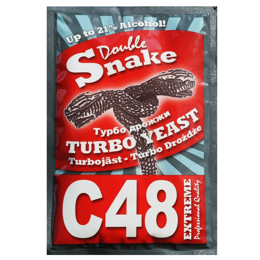 Новая серия турбо дрожжей шотландского производителя компании Hambleton Bard, торговой марки Alcotec - Double Snake C48 Turbo Yeast, которые по сути являются экстримальными дрожжами для переработки сахарозы, способными перебродить 6кг сахара в течение 48 часов, получив при этом до 14% крепости.В соответствии с инструкциями производителя существует четыре способа применения:1. 14% в течение двух дней - 6кг сахара следует растворить в 20л воды, температура 20-35°C;2. 17% в течение трех дней - 7кг сахара следует растворить в 20л воды, температура 20-30°C;3. 19% в течение пяти дней - 8кг сахара следует растворить в 20л воды, температура 20-27°C;4. 21% в течение 7-10 дней - 9кг сахара следует растворить в 20л воды, температура 18-24°C.Применение:Растворите от 6 до 9кг сахара в 20л горячей воды. Когда температура жидкости опустится до 25-30°C, добавить содержимое пакета и тщательно перемешайте жидкость в течение минуты. Рекомендуемая температура брожения 20-30°С. Оптимальная - 25°С.Ингредиенты:Дрожжи, питательные вещества, витамины и микроэлементы.