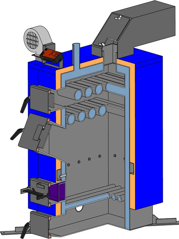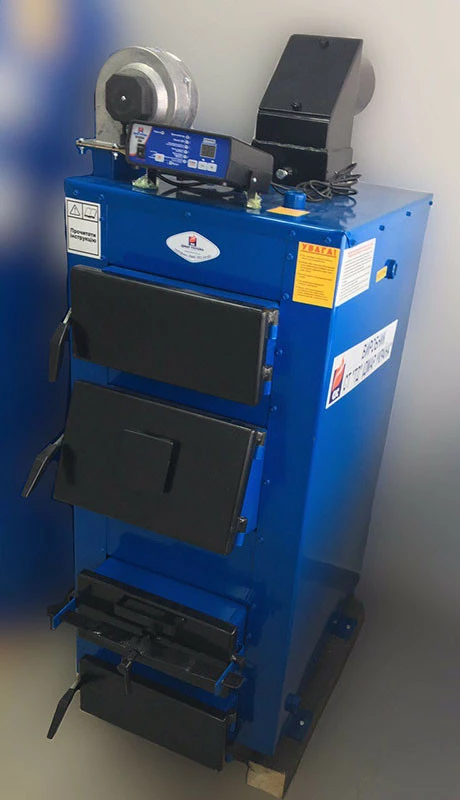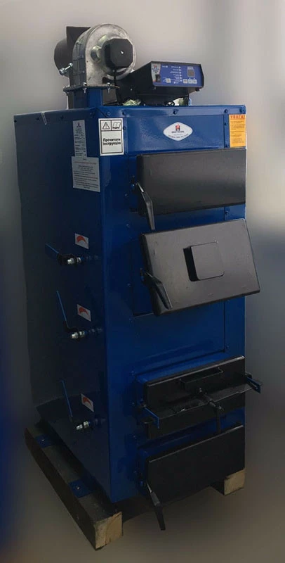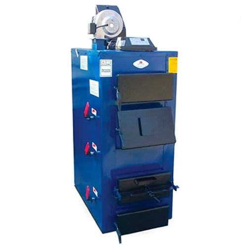 Данный котел работает со всеми видами твердого топлива (антрацит, уголь, бурый уголь, кокс, дрова, опилки и т.д.) Коэффициент полезного действия в зависимости от топлива составляет от 82% до 89% , Данный котел может работать при одной загрузке от 14 до 50 часов, в зависимости от энергоемкости топлива.