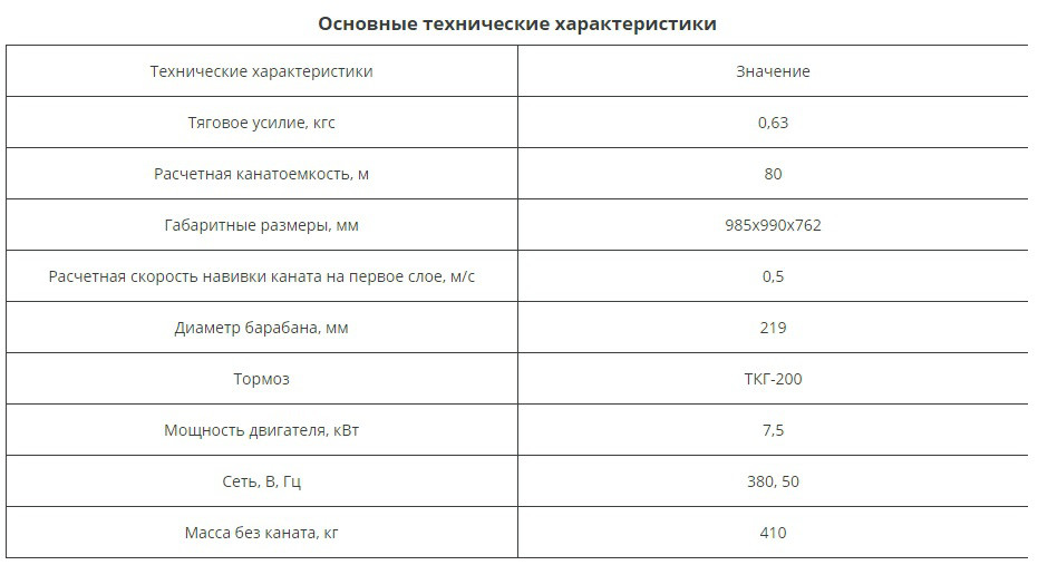 Лебедка тяговая, работающая от энергии двигателя, соответствует серии ТЛ-9А-1 и рассчитана на поднятие и перемещение грузов массой до 1250 кг. Согласно ее техническим требованиям, лебедка должны быть закреплена в горизонтальном положении и эксплуатироваться согласно ГОСТ 15150 в условиях неагрессивной среды и несильной запыленности воздуха. Взрывоопасная среда не допускается. При необходимости агрегат может быть укреплен взрывозащищенным кожухом.