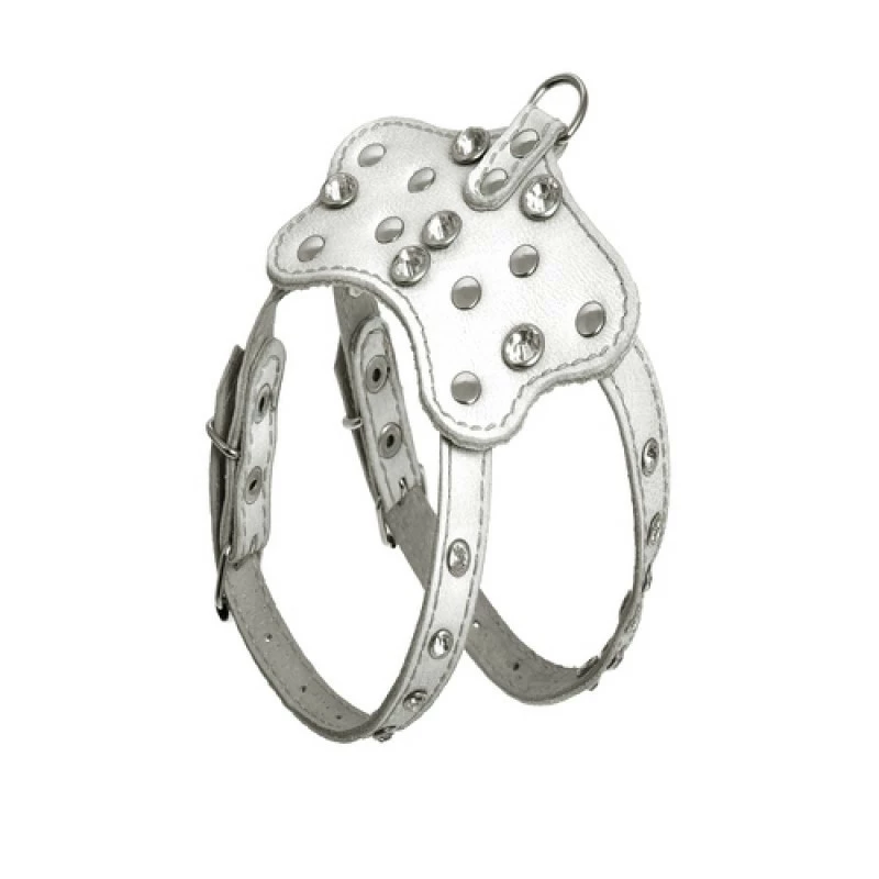 Перламутр :Комплект для декоративних порід прикрашений стразами. Матеріал - шкіра декор; шкіра спилок. Шлейка: Ширина 12 мм, довжина (А) 28-34 см, довжина (У) 38-44 див. Довжина приводу 120см