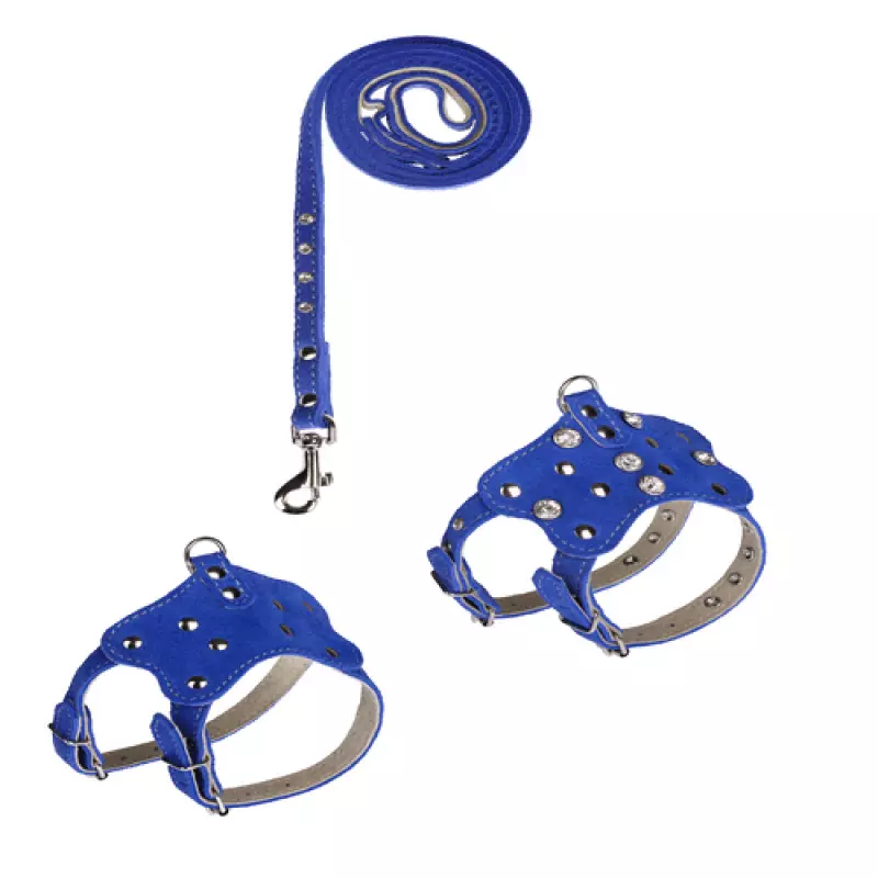 Велюр: Комплект подвійний для декоративних порід прикрашений стразами. Матеріал - замшева шкіра; шкіра спилок.