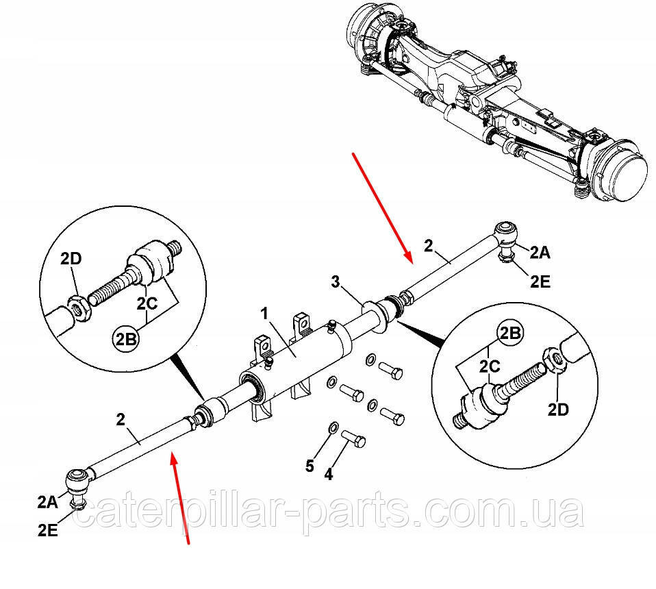 Рулевая тяга переднего моста экскаватора-погрузчика 3CX Super, 4CX. Это неотъемлемая часть рулевого управления которая служит для передачи на поворотный кулак (ступицу колеса) усилие, которое необходимо необходимое для поворота колес на определенный угол и в определенную сторону. Рекомендуется менять одновременно с обеих сторон, при появлении люфта в узле.
