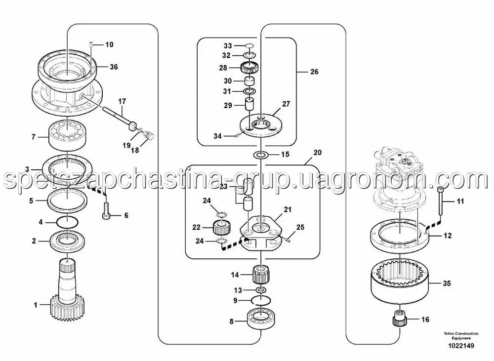 Планетарна передача бортового редуктора вирівнює момент, що крутиться, і передає оптимальні обороти на провідні колеса. VOE 14516445 Редуктор поворотний застосовується в системі повороту платформи на гусеничних екскаваторах Volvo EC210B, EC210.