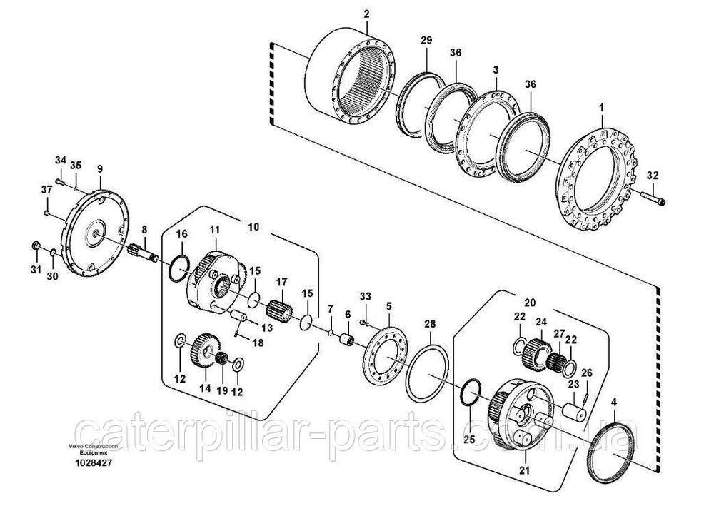 Передача моменту: Змінений момент, що крутить, передається до вихідного валу редуктора ходу, який пов'язаний з гусеницями або колесами екскаватора. Це дозволяє приводити їх у рух та забезпечувати пересування машини.