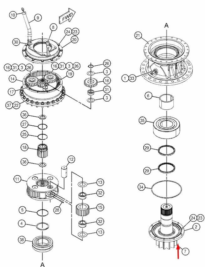 Вал-шестерня використовується для групи приводу повороту, яка забезпечує зниження передачі між двигуном повороту та механізмом повороту, а також спосіб утримання верхньої частини стаціонарного обладнання машини щодо нижньої частини машини.