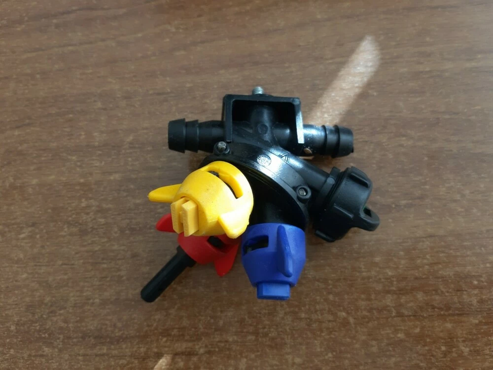 3-х позиційна форсунка корисна якщо потрібно часто змінювати норму внесення (на ділянках малої площі з різними культурами. Є можливість установки одночасно трьох розпилювачів різних типорозмірів, міняючи їх, коли потрібно, і не втрачаючи при цьому препарат, витрачаючи на це мінімум часу і не докладаючи особливих зусиль. Все, що потрібно, - простий поворот корпусу форсунки в напрямі за годинниковою стрілкою, так аби сопло потрібного розпилювача було направлене вниз, після чого можна запускати процес обприскування. Брати участь в обприскуванні буде лише розпилювач, що знаходиться в робочій позиції, а останні працювати не будуть. У форсунки в комплекті є відсікач, і працює вона точно так, як і звичайна форсунка на один розпилювач.