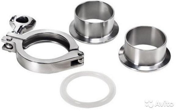 Кламповое з'єднання в зборі. Стандарт SMS76Матеріал - нержавіюча сталь AISI 304.Ущільнення силікон.Зовнішній діаметр приварний частині 76 мм.Товщина стінки 2 ммДіаметр затискний частини 91 мм.