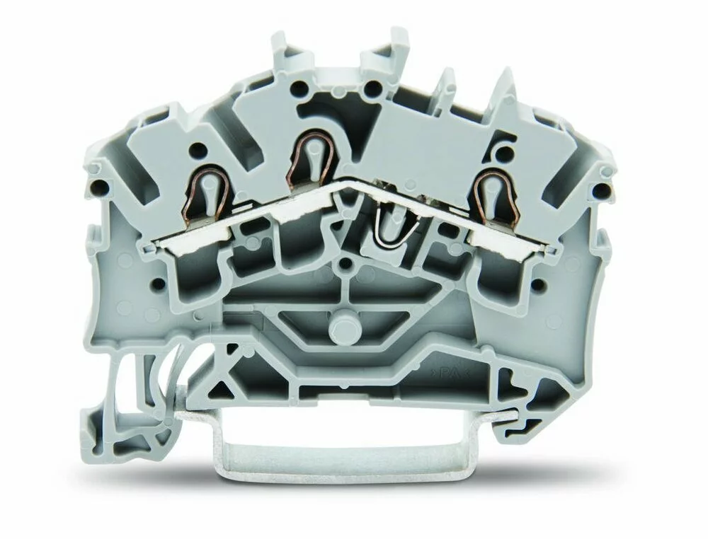 3-провідні прохідні клеми 2,5 мм² Wago 2002-6301, підходять для виконань Ex e II; бічна і центральна маркування; для DIN-рейки 35 x 15 і 35 x 7,5; Push-in CAGE CLAMP®; 2,50 mm²; сірі.