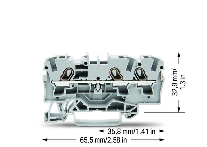 3-провідні прохідні клеми 4 мм² Wago 2004-1301, підходять для виконань Ex e II; бічна і центральна маркування; для DIN-рейки 35 x 15 і 35 x 7,5; Push-in CAGE CLAMP®; 4,00 mm²; сірі.