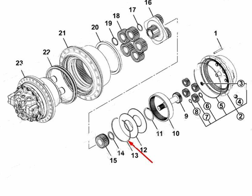 Внутрішнє кільце стопорне ексцентричне плоске пружинне. Бортовий редуктор гусеничного екскаватора – це планетарна передача, що приводить у дію гідромотор. Ходовий редуктор у зборі з гідромотором ходу встановлюються у ходовий візок.