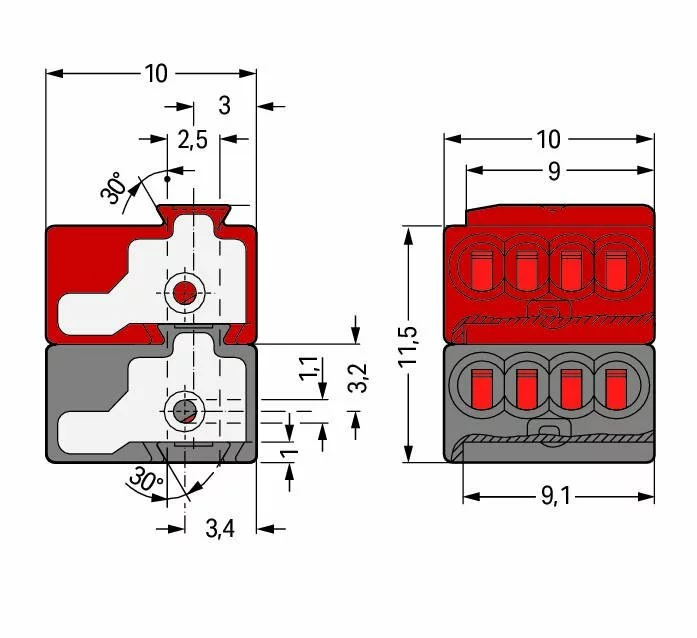 4-дротяний з'єднувач для друкованої плати Wago 243 серії: для індивідуальних виведень під пайку; для KNX; Ø 0,8 мм; Крок контактів 5,75 мм; 2-пол.; темно-сірі/червоні.