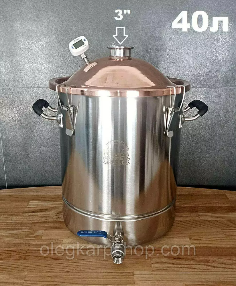 Перегінний куб з мідною сферичною (купольною) кришкою під кламп 2"Термометр електроннийНіпель під термометр, нержавійкаКран зливний, нержавійка, різьба 1/2" внутрішня Додаткові опції:Встановлення 3" кламп на кришку замість 2" Встановлення 4" кламп на кришку замість 2" Встановлення 2" клампу під тен Додатково можна придбати:Тен 3 кВт, нержавійкаТен 2,5 кВт, нержавійка (антипригарний)Тен 3,5 кВт, нержавійка (антипригарний)Тен 4,5 кВт, нержавійка (антипригарний)Регулятор потужності з ПЗВ (пристрій захисного виключення)ФальшдноСито (бункер) для затирання Характеристики:Харчова нержавіюча сталь AISI304Харчова мідь марки М1Об'єм ємності 40лРозміри (діаметр/висота з клампом): ≈35/50 см.Об'єм кришки: ≈ 2,9 лТовщина крихітки 1,2 мм.Товщина стінок куба 1 мм.Товщина дна близько 5 мм.Дно плоске, трихшарове, з алюмінієвим прошарком для рівномірного розподілу тепла.Матеріал дна AISI 430 (магнітна харчова нержавійка)Прорезинені ручкиМуфта під кран з зовнішньою різьбою 1/2".Кран з харчової нержавійки 1/2"Ребро жорсткості для встановлення фальш дна на відстані близько 80 мм. від днаКількість зажимів 5 шт.