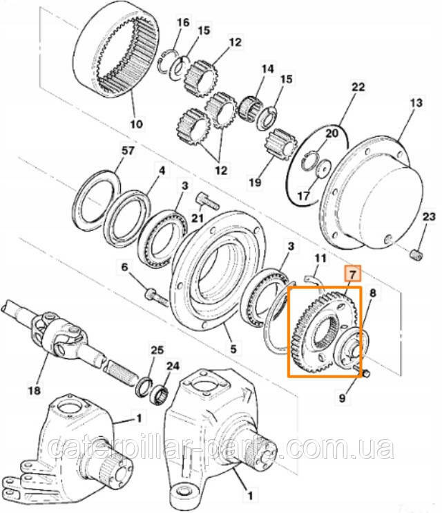 Ступица коронной шестерни в бортовой редуктор экскаватора-погрузчика JCB 3CX Super, 4CX. Еще называют шестерней ступицы или промежуточной шестерней. Устанавливается в коронную шестерню. Используется для фиксации коронной шестерни, крепится восемью болтами к корпусу поворотного кулака. Рекомендуется менять при замене коронной шестерни.