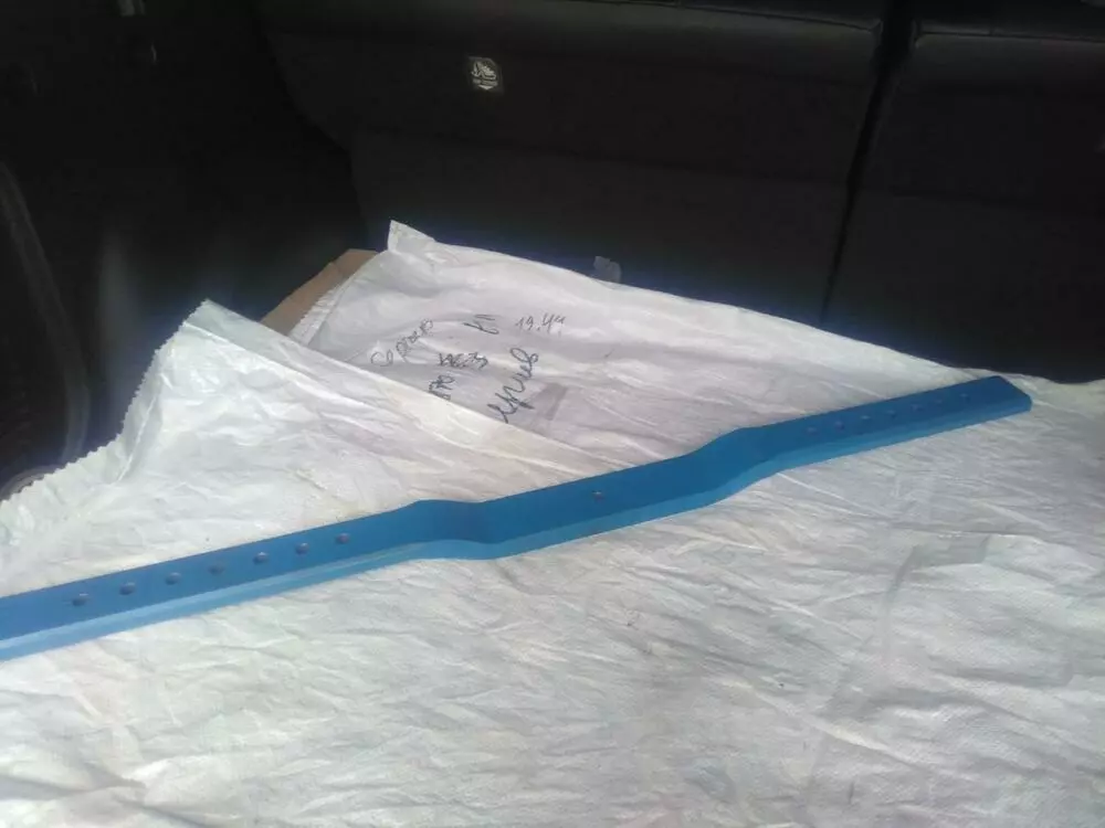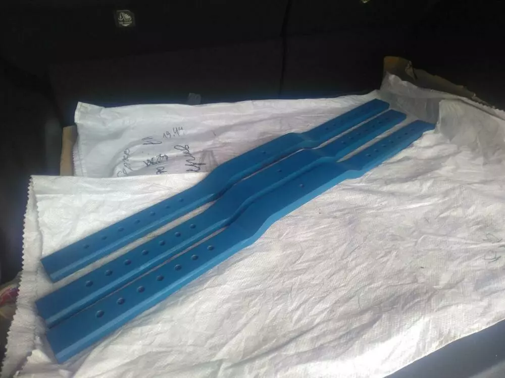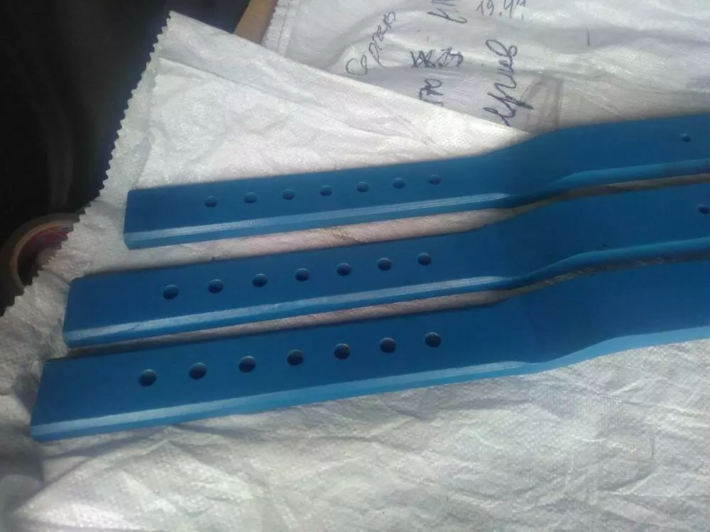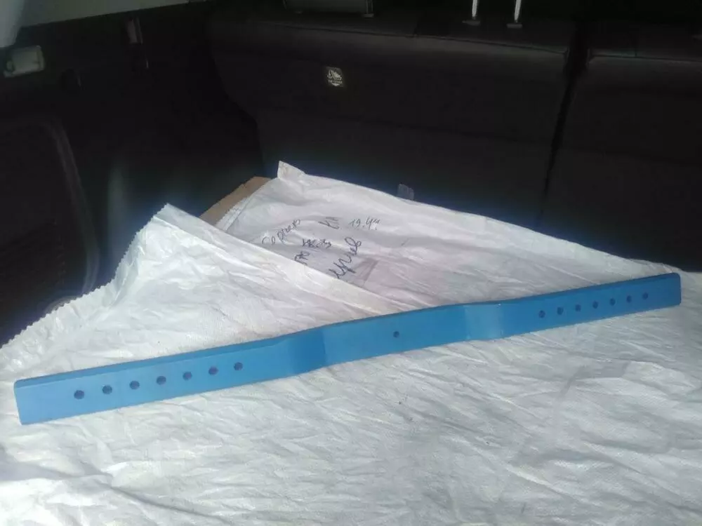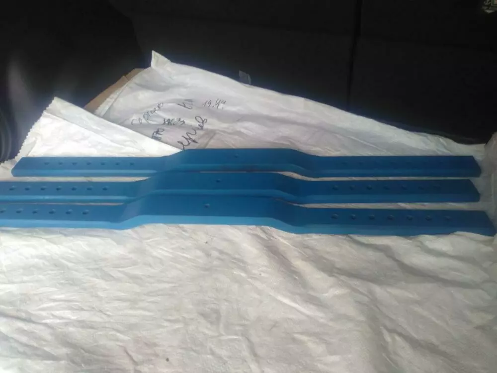 общая длина=1070 мм, ширина=60 мм, толщина=22 мм, расстояние между центрами отверстий=35 мм, диаметр центрального отверстия=10 мм, диаметр остальных=12,2 мм.