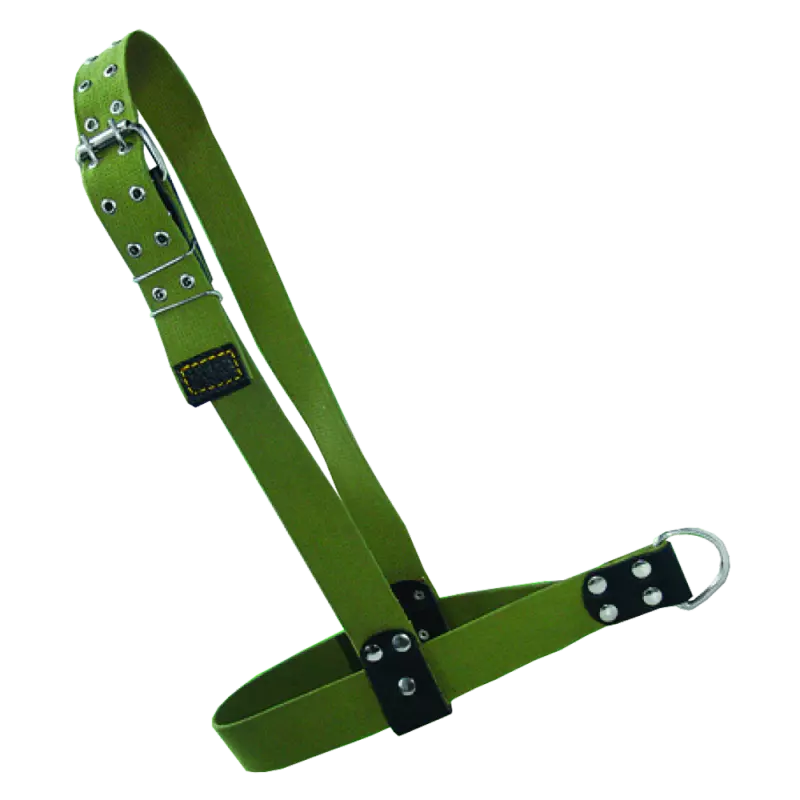 Недоуздок для корови з брезентової ремінної стрічки та шкіряними вставками, які застосовуються для посилення недоуздка.