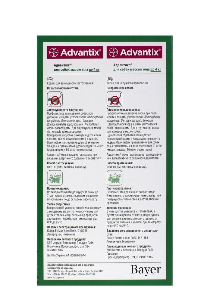 Адвантикс краплі для собак вагою до 4 кг (4 піпетки по 0.4 мл) Elanco