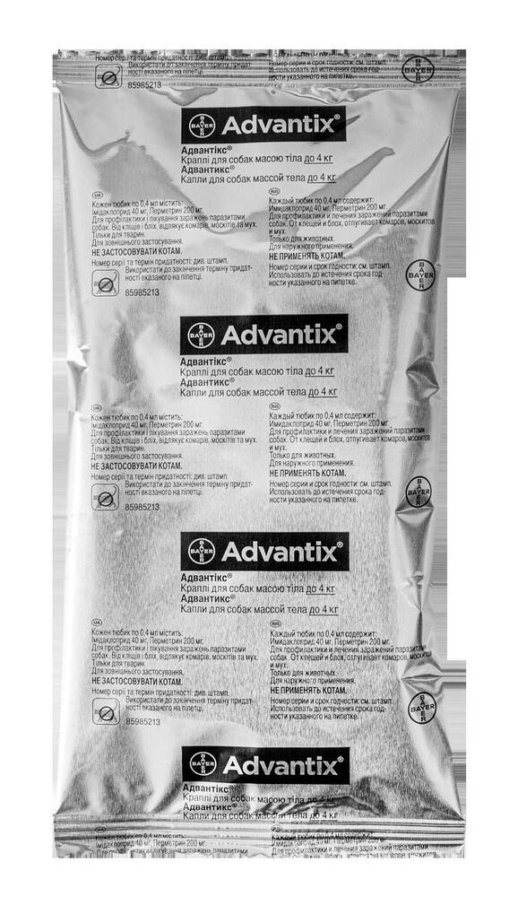 Адвантікс (для собак до 4 кг) – універсальне рішення для захисту собак від бліх, кліщів, комарів, москітів, волосоїдів та мух. Зручні у використанні краплі Адвантікс діють до 4-х тижнів. Препарат не лише знищує, а й відлякує кровосисних паразитів, попереджаючи їх живлення кров’ю. Менше укусів – менше ризику зараження небезпечними захворюваннями.