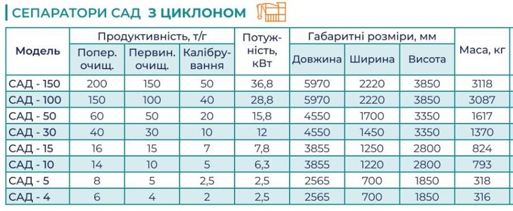 Сепаратор САД-30 з циклоном отримав широке застосування, як на крупних елеваторах, так і в невеликих фермерських господарствах, які займаються вирощуванням товарного зерна. Унікальність даного обладнання у високоточному калібруванні зерна за питомою вагою, однорідність насіння при сепарації ± 3%, що дає можливість виділяти зерно з підвищеним вмістом клейковини, високим вмістом білка. Якісні показники сепарації вище, ніж на відомих до теперішнього часу сепараторах та калібрувальних машинах.
