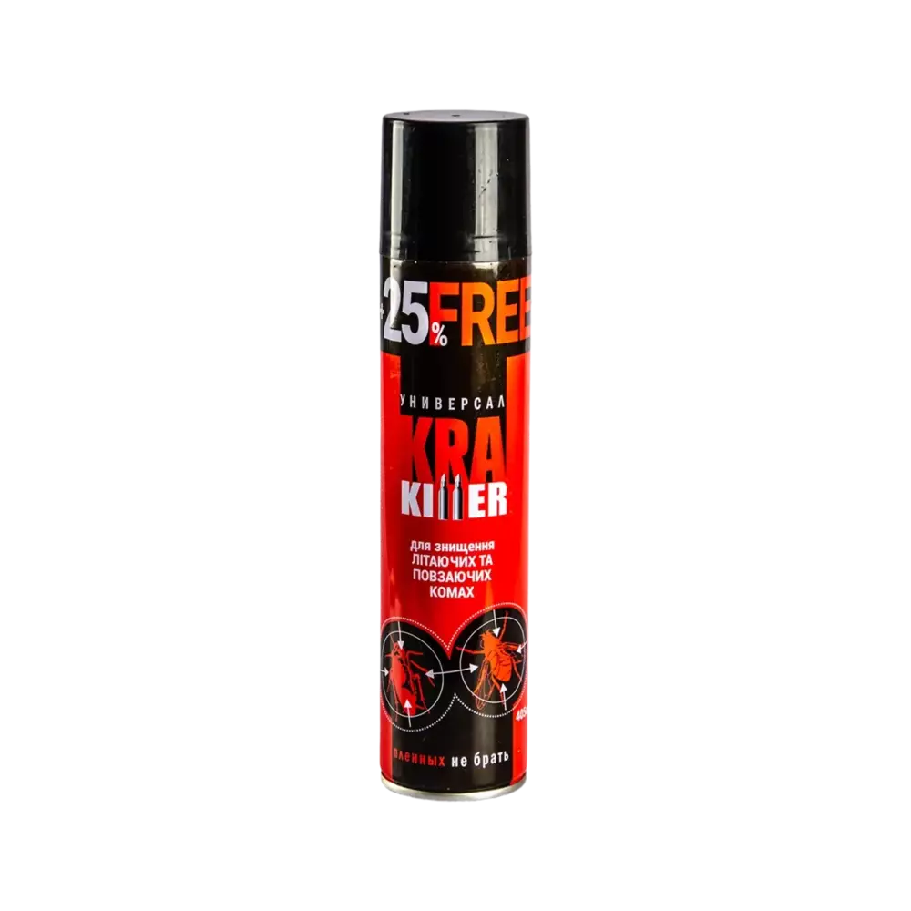 Аерозоль від тарганів та інших комах, що літають і повзають. KRA -KILLER Універсал від повзаючих і літаючих: тарганів, ос, клопів, молі, бліх, мурах, 405 мл (червоний) комарами і личинок і дорослих особин. Загибель комах відбувається протягом декількох хвилин після застосування. Оскільки аерозоль KRA не має запаху, він добре підходить для використання в приміщенні. Обробку приміщення рекомендується проводити при закритих вікнах, а люди та тварини повинні залишити приміщення щонайменше на годину. Через годину після обробки приміщення необхідно провітрити та провести вологе прибирання. Не розпорошувати біля харчових продуктів. Також дуже ефективний у боротьбі з осами.
