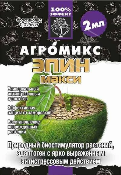 Брассинолид 0.025 г/кг. Природний біостимулятор рослин, адаптоген з яскраво вираженим антистресовою дією. Забезпечує: Прискорене проростання насіння; Прискорення росту розсади при пікіровці та пересадці; Прискорення дозрівання і збільшення врожайності; Захист рослин від заморозків та інших несприятливих умов; Підвищення стійкості до фітофторозу, перроноспорозу, парші, бактеріозу та фузаріозу; Відродження ослаблених і омолоджування старих рослин за рахунок стимуляції бічного пагоноутворення; Зниження в рослині кількості токсинів, важких металів, радіонуклідів, надлишок нітратів. Тому особливо показаний при: Заморозках, Підтоплення, Нашестя шкідників та ін., тобто показаний при будь-яких стресових для рослин ситуаціях, особливо ефективний при завчасній обробки рослин, наприклад перед пересадкою розсади. Використання Епіне-максі: 2 мл (1 ампула) епіне-максі на 10л води 1 ампула - 2 мл або приблизно 80 крапель. Передпосівна і передпосадкова обробка. Насіння овочевих культур замочують у розчині Епіне-максі (1-2 краплі на 100 мл води для томатів, огірків, перців, баклажанів) 18-20 годин при температурі +20С. Насіння квіткових культур 4 краплі епіне-максі на 100мл води на 18-20 годин. Цибулини квіткових культур і живці замочують перед посадкою в розчині Епіне-максі (2мл на 4л води) 24 і 12 годин відповідно. Бульби картоплі обприскують перед посадкою (2мл на 500мл води на 100 кг картоплі). Обприскування вегетуючих рослин 2мл Епіне-максі розчиняють у 10л води і ретельно перемішують. Обприскування проводять рівномірно змочуючи листя. Робочий розчин використовують відразу після приготування. Не допускати лужного середовища. Розсаду-обприскують розчином Епіне-максі (5-6 крапель на 0,5 л води) у фазі 2-3 справжніх листків і напередодні пересадки. Обробка рослин проводиться в такі фази: Картоплю, томати – бутонізація -початок цвітіння; Коренеплоди - по сходам; Огірки – 2-3 справжніх листків з повторенням у фазі бутонізації; Перці – на початку бутонізації з повторенням у фазі цвітіння; Тюльпани – при появі бутонів; Плодово-ягідні – у фазі бутонізації з повторенням через 20 днів; Витрата становить 2-5л розчину на молоде дерево і 5-8л розчину на доросле дерево); При стресових умовах вирощування (недолік світла, заморозок, початок хвороб і т. д.) обприскування проводять кожні 7-10 днів до видужування рослин. Препарат практично не небезпечний для людини, теплокровних тварин, риб, бджіл та інших корисних комах. Не забруднює навколишнього середовища. Клас небезпеки 3 (в якості розчинника використовується технічний етиловий спирт з добавкою шампуню для кращої змочуваності поверхні листя). Термін зберігання 3 роки з дати виготовлення